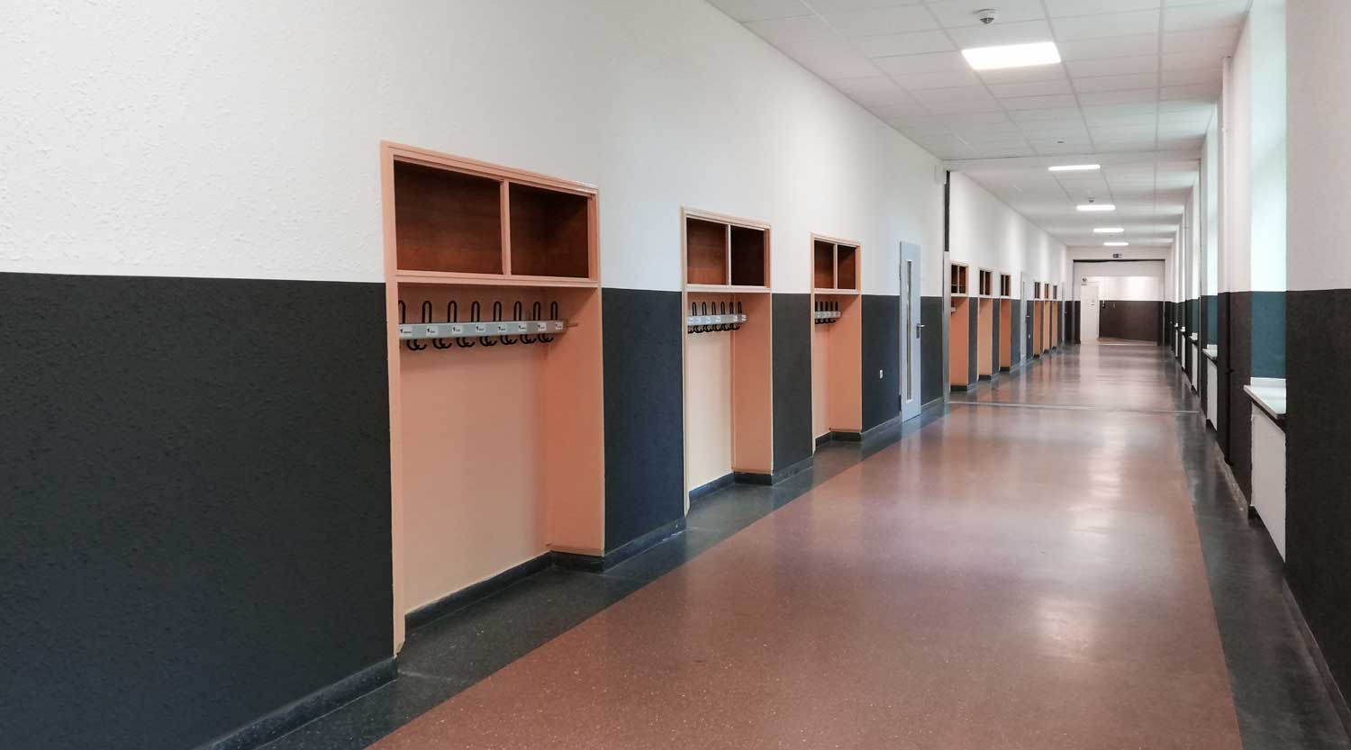 In den nächsten Ferien wird der Verlauf der Rettungswege auf den Bodenflächen markiert, sodass in den Fluren Arbeitsbereiche für Einzelschüler und Kleingruppen eingerichtet werden können.