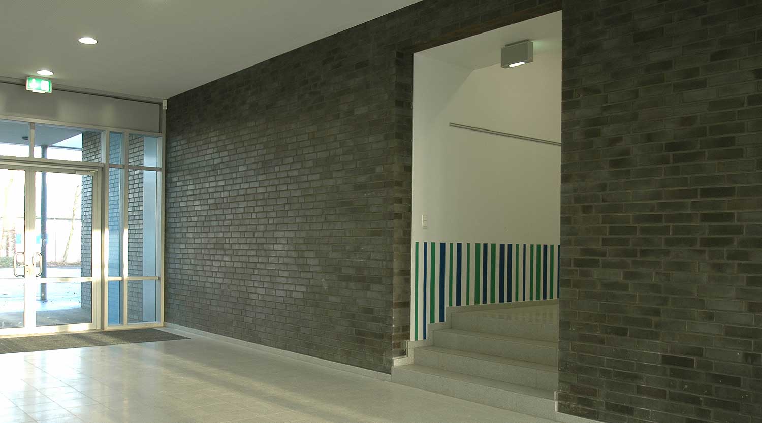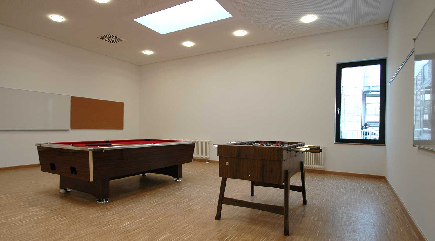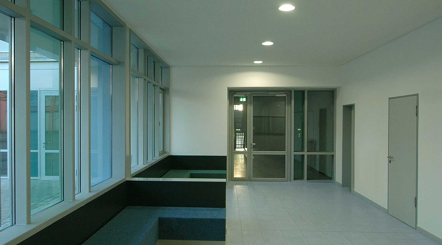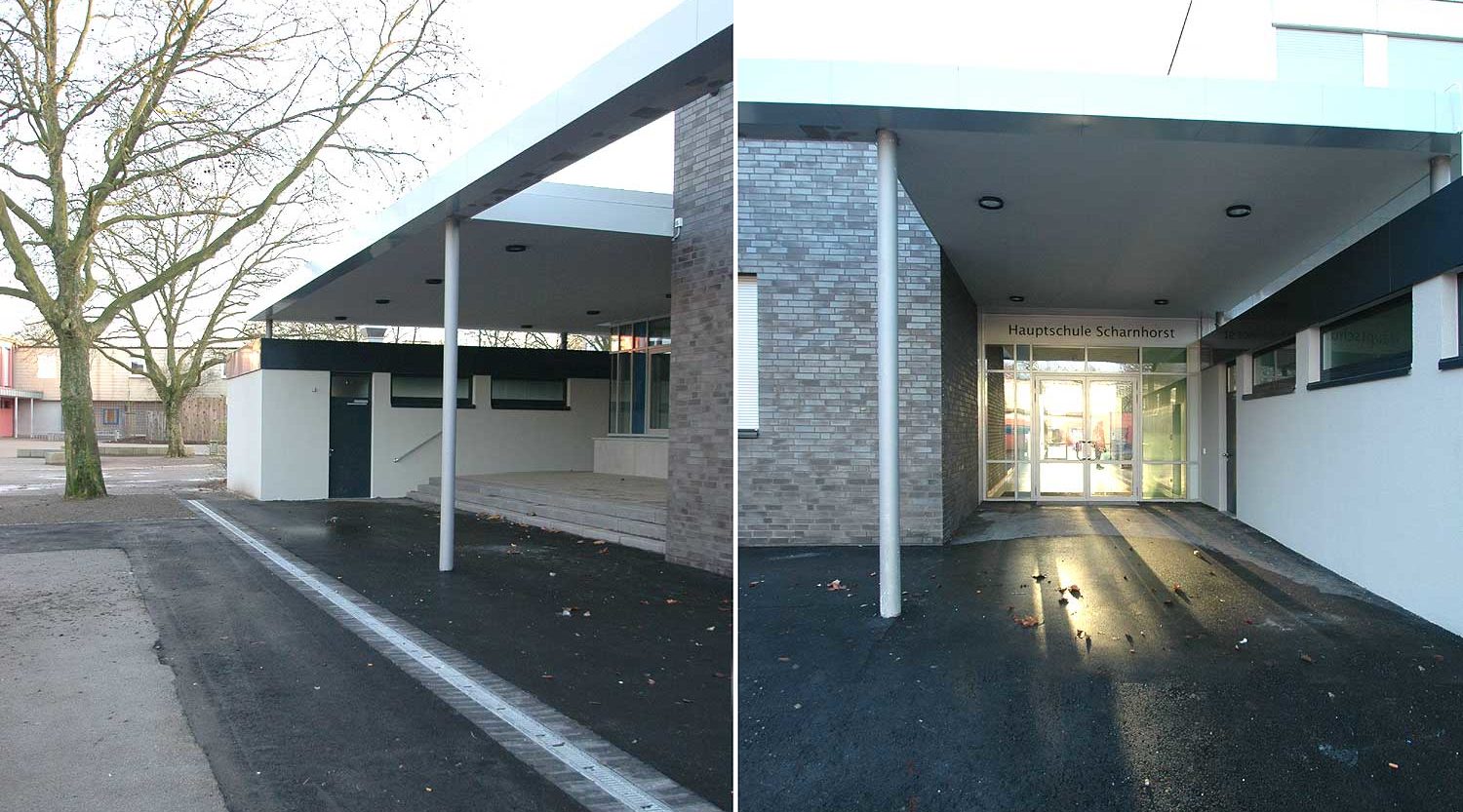 Die Hauptschule Scharnhorst in Dortmund wurde um Räume zur Ganztagesbetreuung erweitert. Besonders für die Pausen in den Mittags- und Nachmittagsstunden wurden Spiel- und Freizeiträume sowie ein Speiseraum mit Aufwärmküche gewünscht.