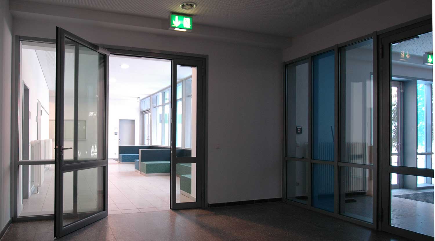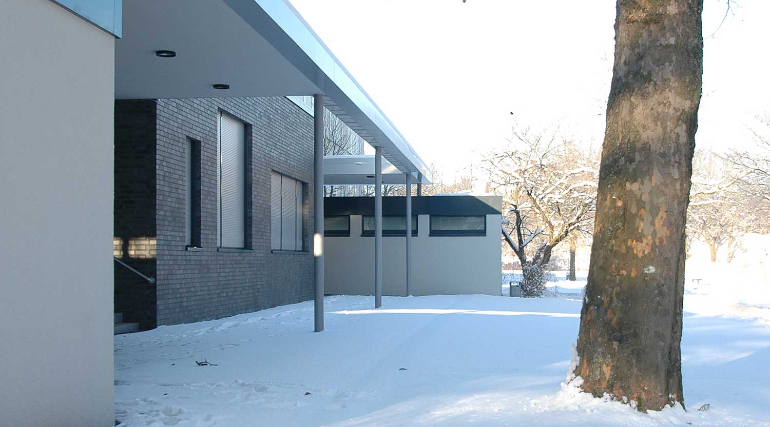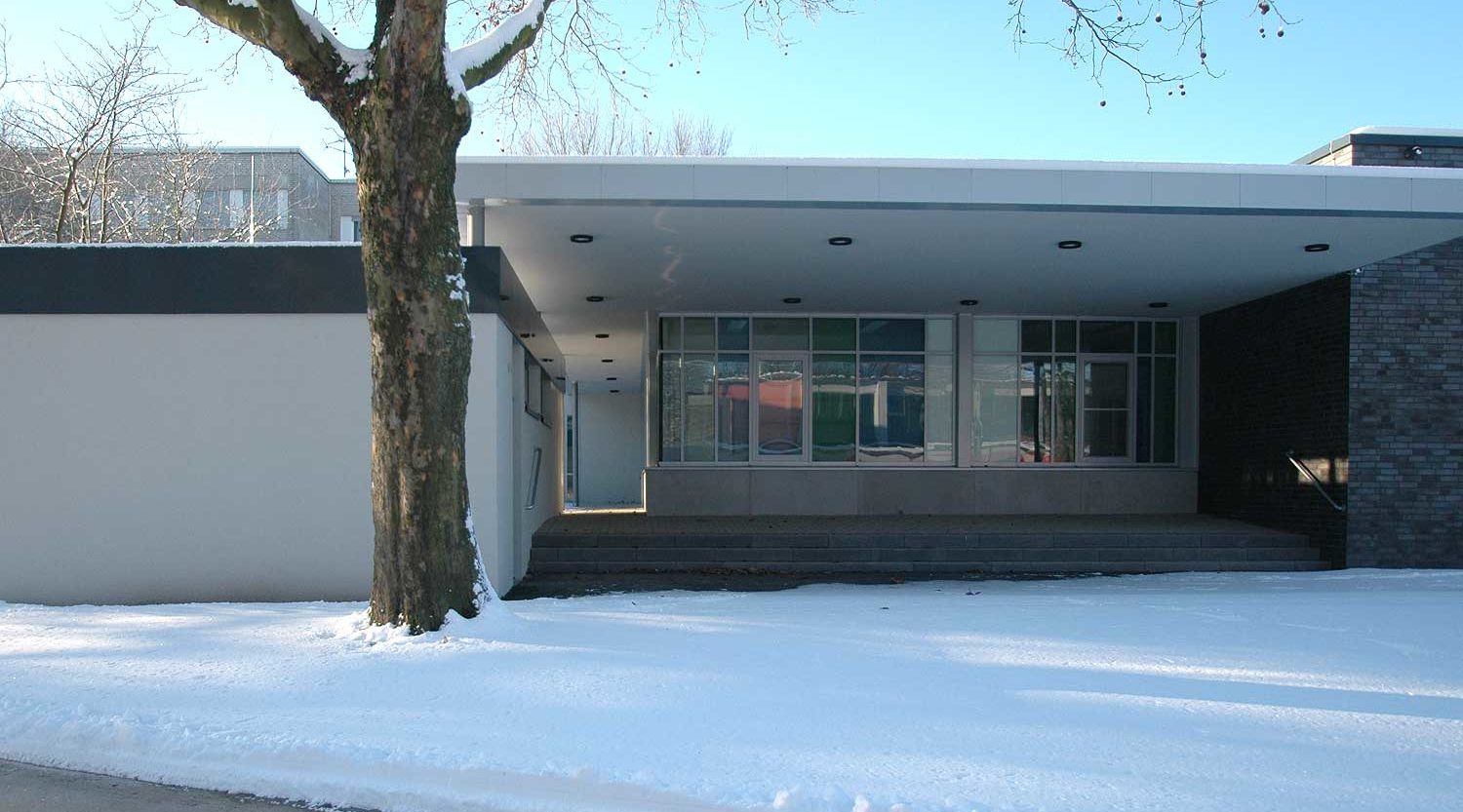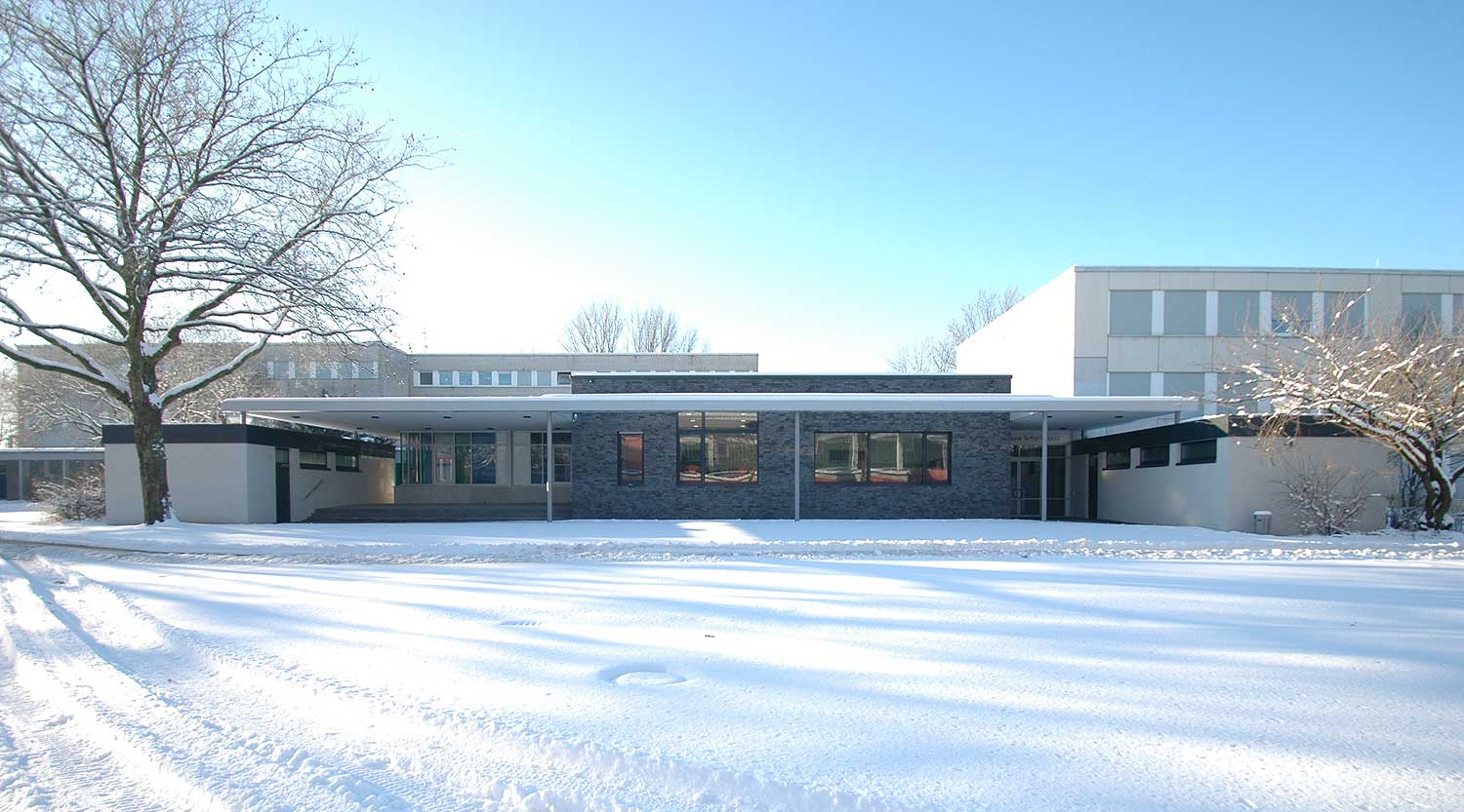 Die zwischen den beiden Hauptbaukörpern der Schule vorhandene Aula wurde nach wirtschaftlicher und baulicher Prüfung zurückgebaut.