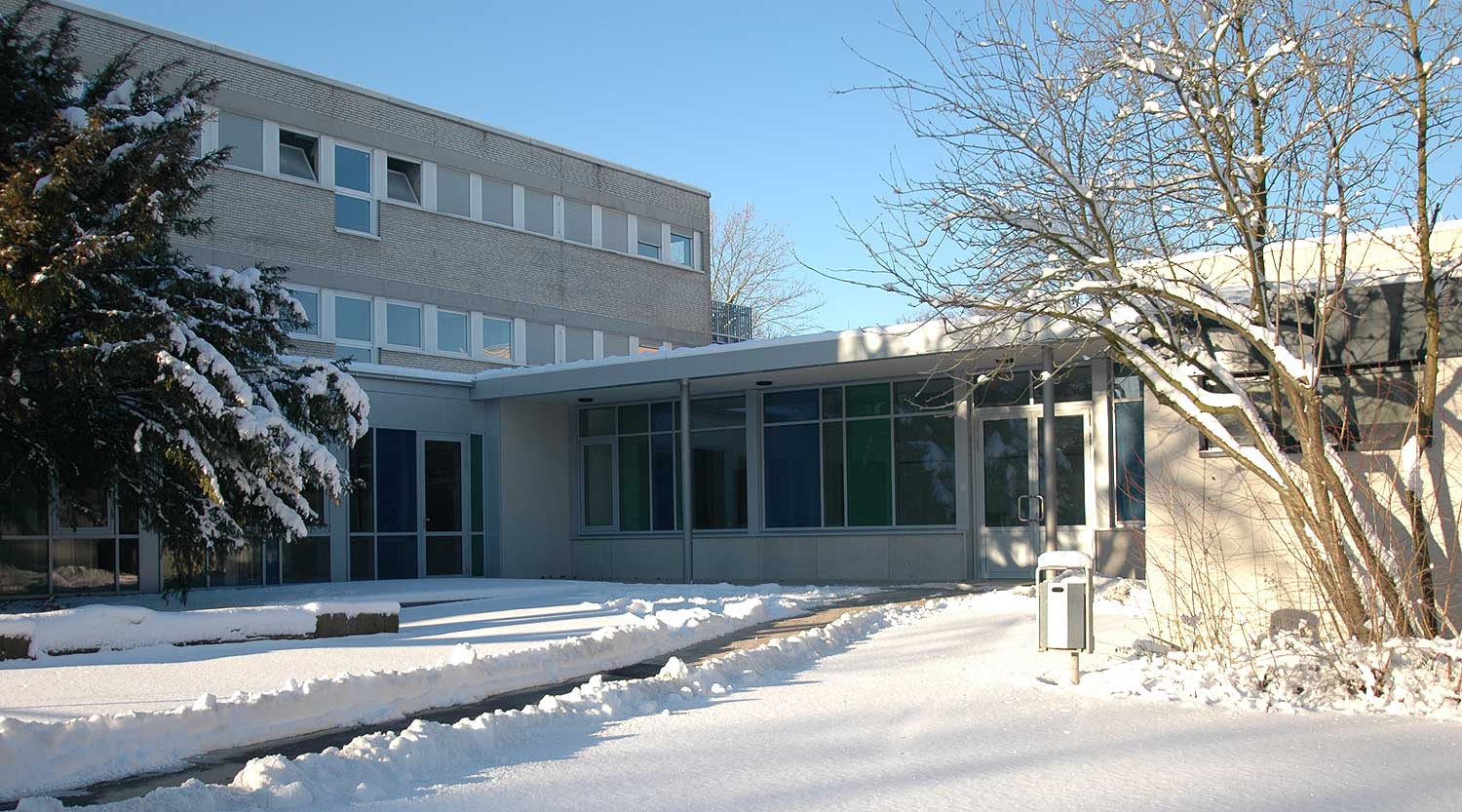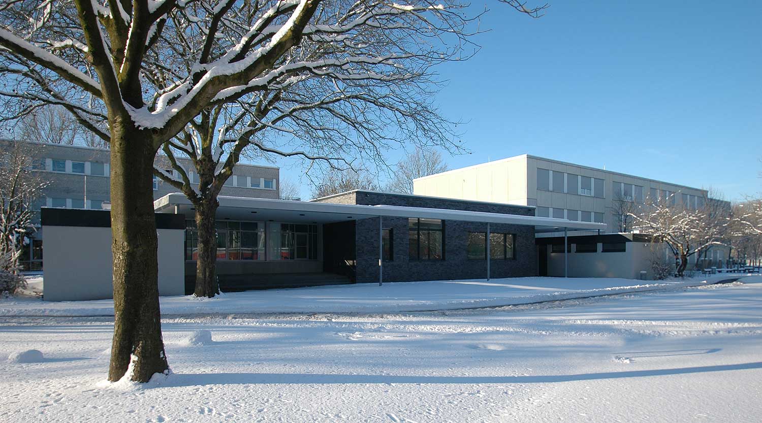 Hier entstand der neue Mittelpunkt der Schule, der die Zentralen Einrichtungen zusammenfasst und eine Mensa bietet.