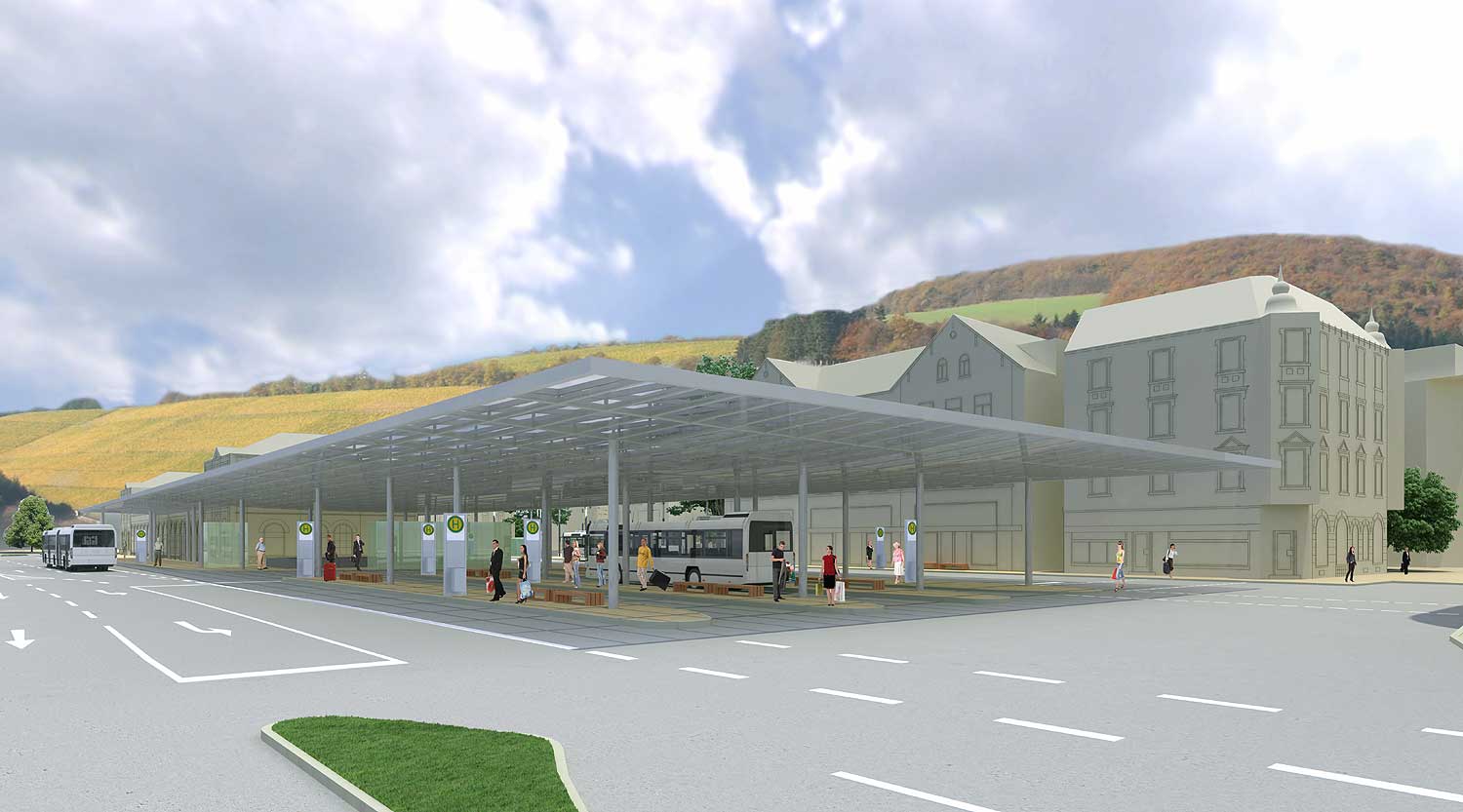 Funktional bietet sich ein gestrecktes Rechteck an, dass für den Großteil der Bushalteplätze wettergeschützten Ein- und Ausstieg gewährleistet.