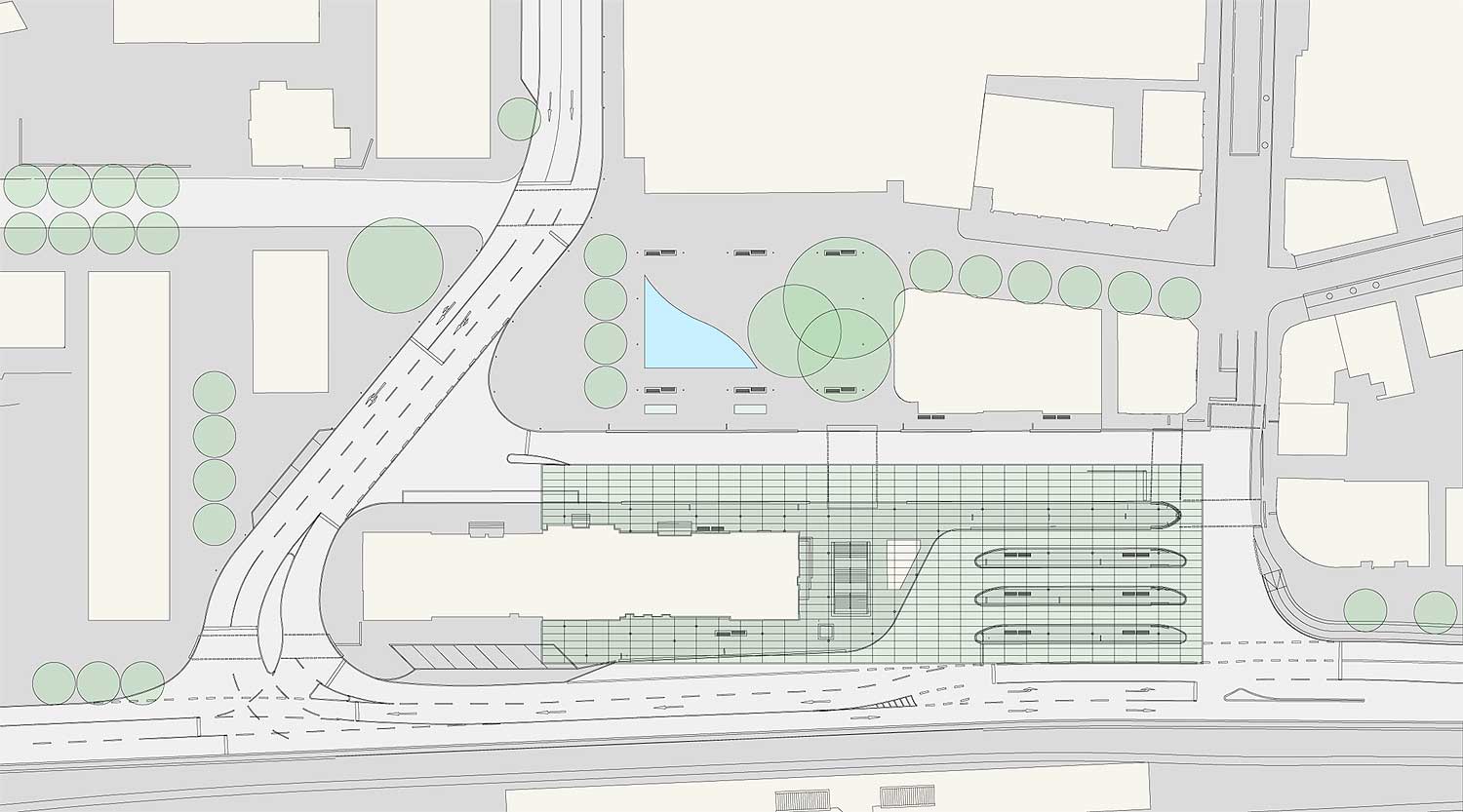 Die verkehrstechnischen Vorgaben ermöglichen kein regelmäßiges Stützenraster, geschweige denn gleichmäßige Stützweiten. Trotzdem sollten sich diese Bedingungen nicht auf die städtebauliche Erscheinung der Überdachung auswirken. Idee ist, eine sehr einfache und geradlinige Dachform, die die heterogenen Einflüsse der Umgebung zu ordnen vermag.