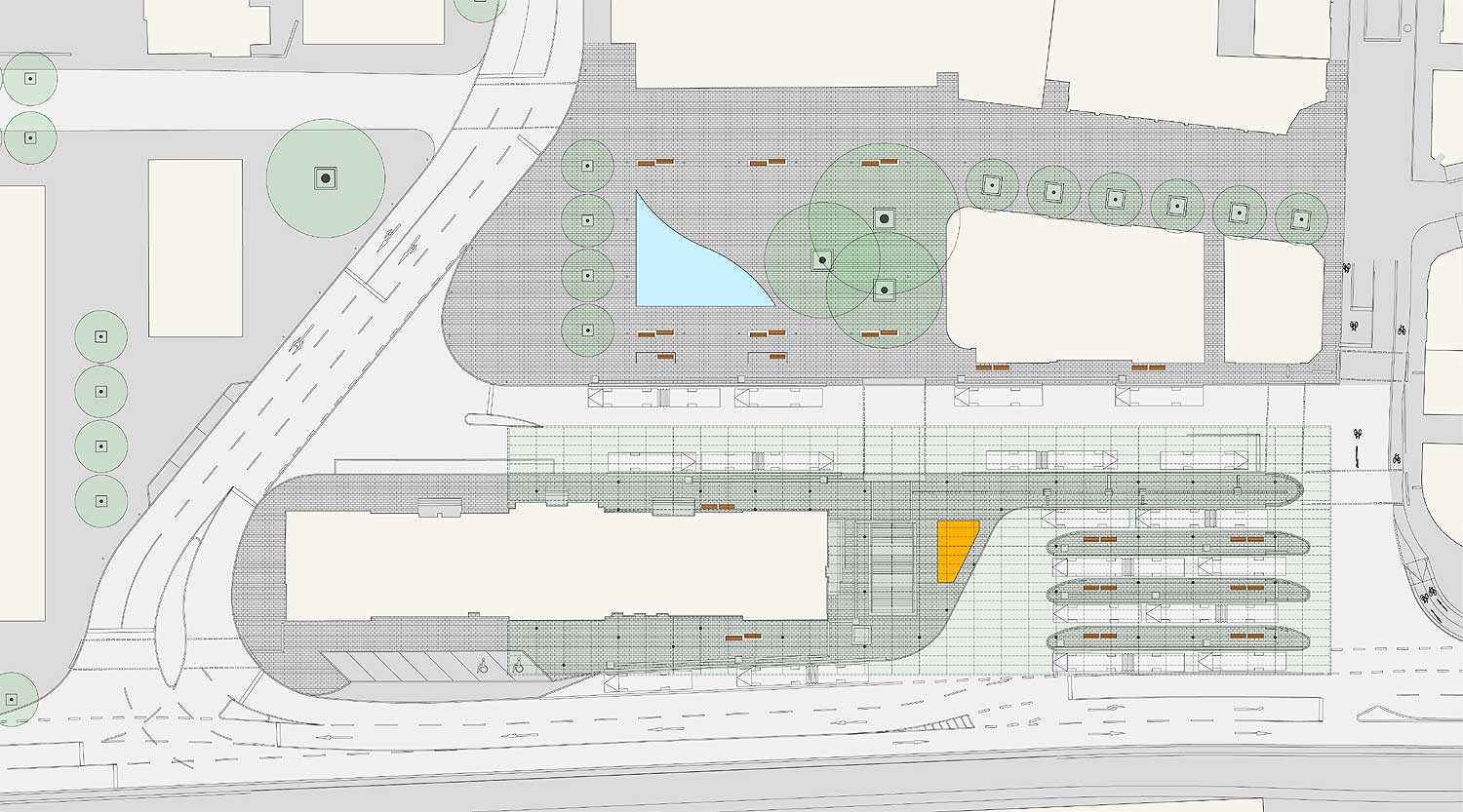 Auf der Platzfläche wird neben den vorhandenen Bäumen ein Wasserbecken vorgeschlagen. Einerseits wird hierdurch die Wegführung zum Hauptüberweg über die Verkehrsfläche unter das Dach eingeleitet. Anderseits überlagert das Geräusch des bewegten Wassers die Verkehrsgeräusche und sorgt so für eine deutliche Steigerung der Aufenthaltsqualität des Platzes.